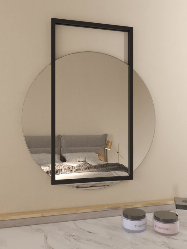 Зеркало «Terraform». Артикул GMZ-07-1/2/3 Эксклюзивное настенное зеркало, которое благодаря своей оригинальной форме идеально подходит для интерьеров, выполненных в современных стилях: хайтек, минимализм, скандинавский, авангардный, лофт, контемпорари. Зеркало круглое, вставлено в промежуток внутри прямоугольной рамы большего размера и выглядит очень эффектно. Рама металлическая надёжная покрыта матовой эмалью, а само зеркальное полотно производства известного бельгийского бренда AGC отличается безупречным качеством. На обратной стороне конструкции имеются специальные приспособления для крепления к стене.Характеристики:– габаритные размеры рамы – 890х740 мм, профиль – 15х15 мм; – диаметр зеркального полотна – 740 мм, толщина – 4 мм; – устойчивая матовая порошковая окраска; – цвета – золотой, чёрный, белый; – саморезы для крепления к стене в комплекте; – вес – 7 кг; – гарантия – 1 год.